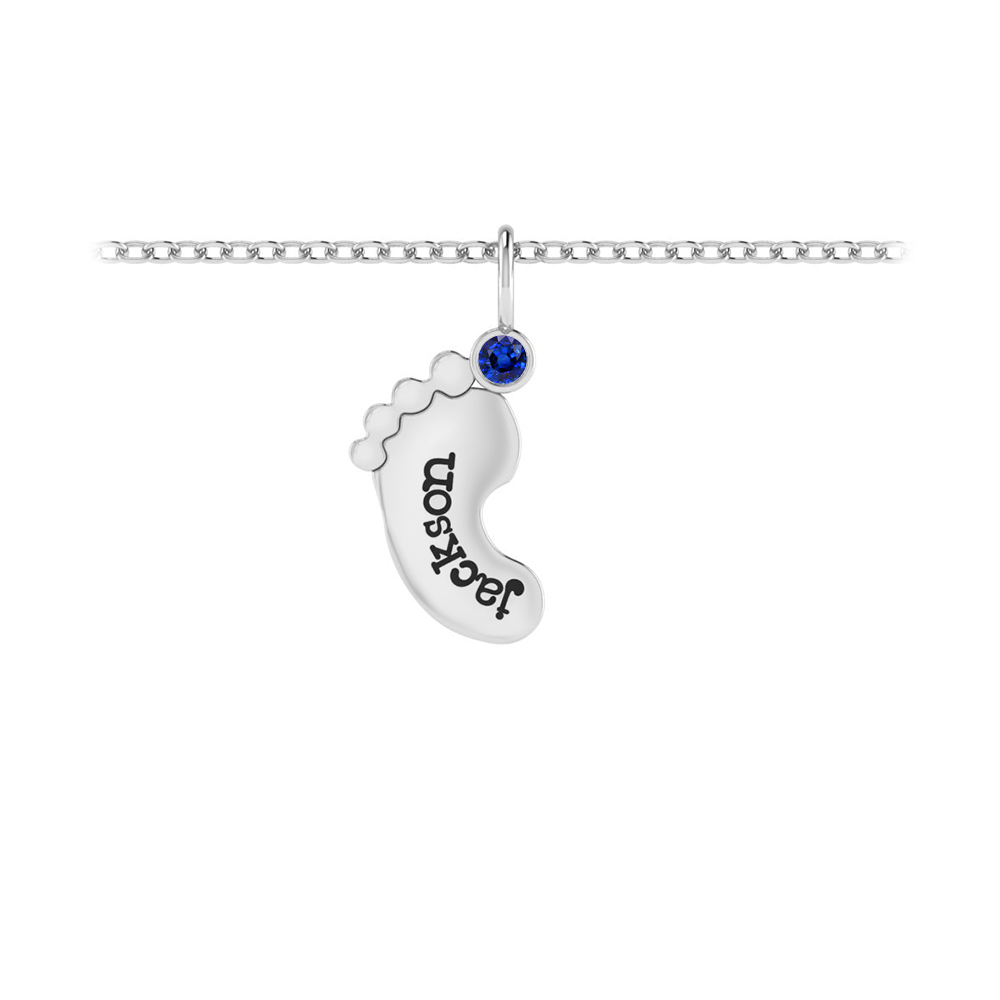 A personalized birthstone charm any mother will adore. This charm features a heartwarming footprint design that brings the memory of your baby's tiny newborn feet back to life. Personalize this charm with up to 7 characters, accented with a lab-created colored birthstone of your choice. Available in Sterling Silver, 10K and 14K White, Yellow, or Rose Gold. Our Personalized Birthstone Footprint Charm is the best gift for new moms.