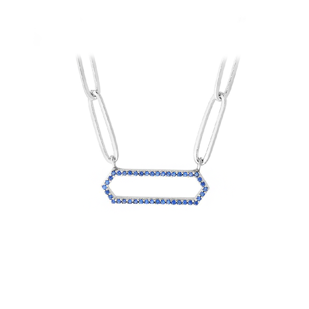 Silver Blue CZ Pavé Hexagon Pendant Paperclip Necklace